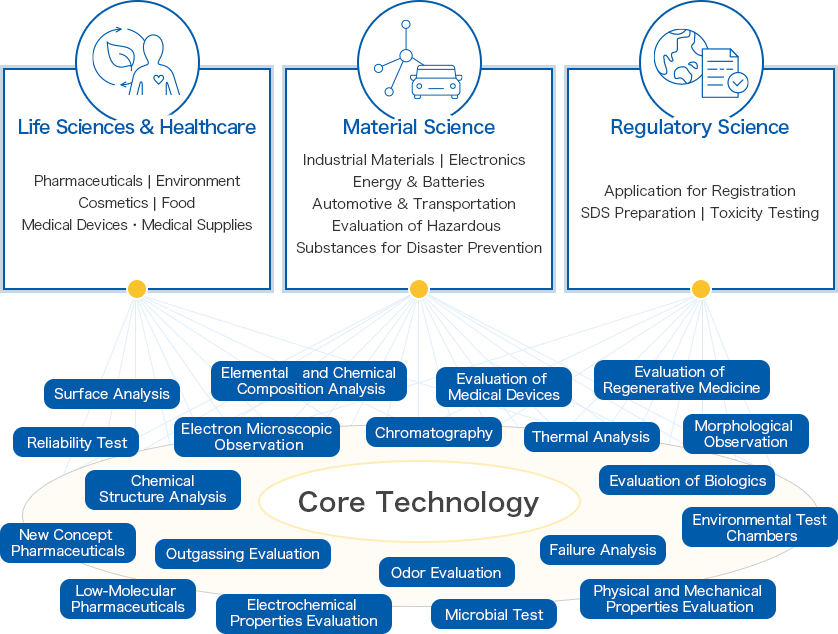 We believe that our superiority lies in our ability to apply our originally developed advanced technologies widely to client services in various industrial fields, not just in some limited industries. Additionally, our analysis and evaluation services go beyond mere provision of individual reports to contribute to clients’ R&D promotion and technical solution for various problems in manufacturing sector, by revealing substantive issues through multifaceted approach combining varieties of analysis and evaluation methods.